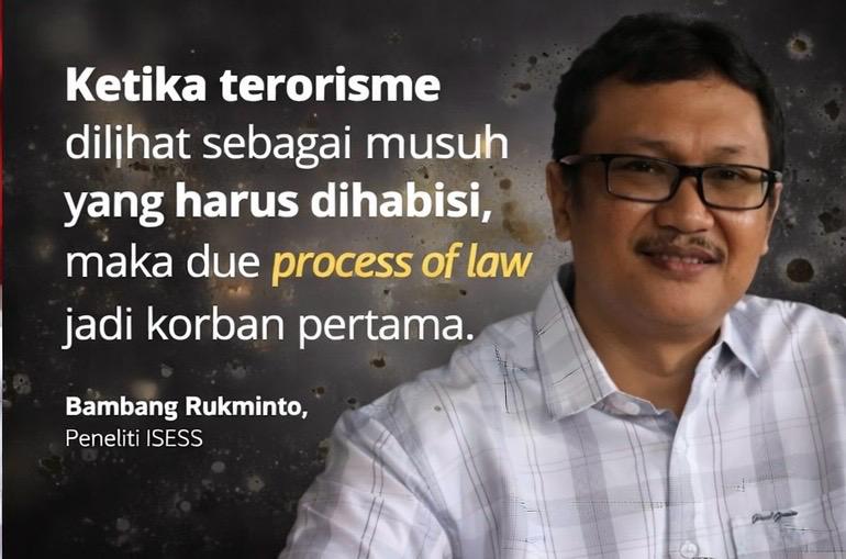 Ia menilai kebijakan pelibatan TNI justru berpotensi mendorong sekuritisasi isu terorisme secara berlebihan. Alih-alih memperkuat peran penegakan hukum oleh Polri, kebijakan tersebut dinilai bisa memperluas peran militer ke ranah keamanan dalam negeri. Jika dibiarkan berkembang tanpa batasan yang jelas, Bambang memperingatkan, situasi ini dapat menggerus prinsip negara hukum dan demokrasi.